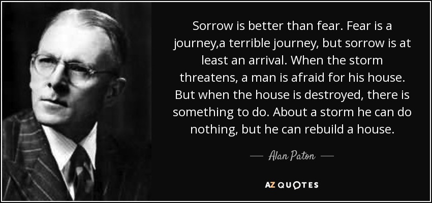 Sorrow is better than fear. Fear is a journey,a terrible journey, but sorrow is at least an arrival. When the storm threatens, a man is afraid for his house. But when the house is destroyed, there is something to do. About a storm he can do nothing, but he can rebuild a house.