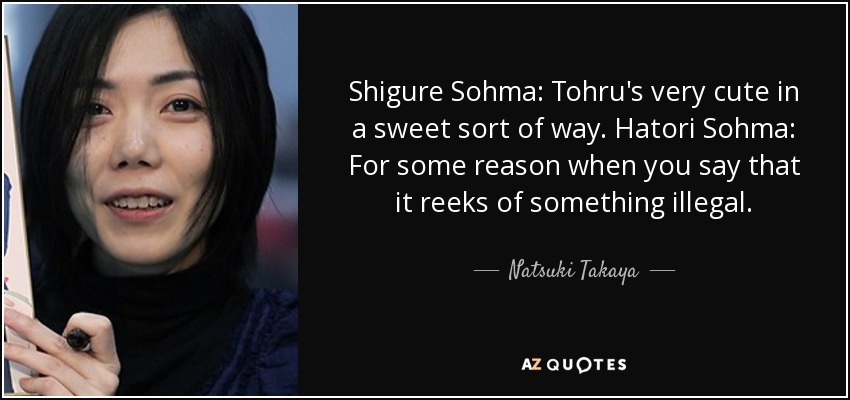 Shigure Sohma: Tohru's very cute in a sweet sort of way. Hatori Sohma: For some reason when you say that it reeks of something illegal.