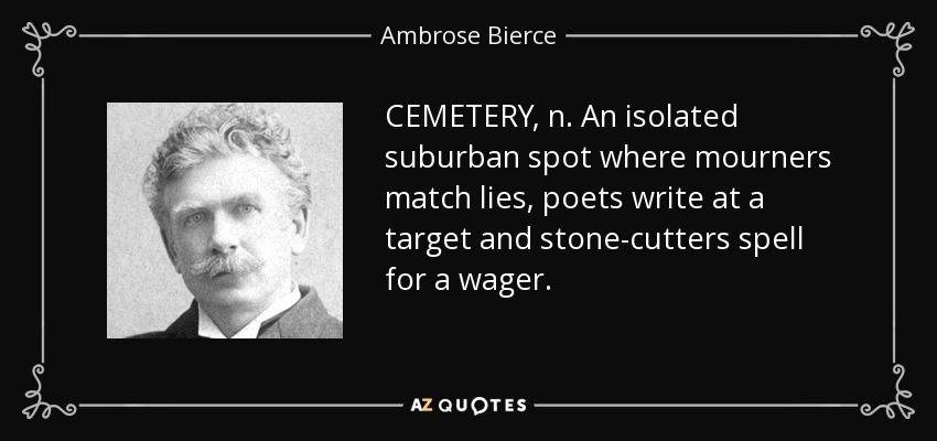 CEMETERY, n. An isolated suburban spot where mourners match lies, poets write at a target and stone-cutters spell for a wager.