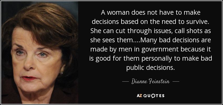 A woman does not have to make decisions based on the need to survive. She can cut through issues, call shots as she sees them....Many bad decisions are made by men in government because it is good for them personally to make bad public decisions.