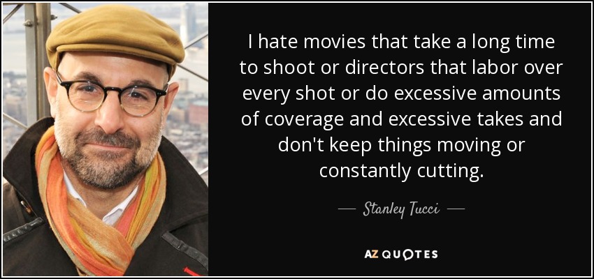 I hate movies that take a long time to shoot or directors that labor over every shot or do excessive amounts of coverage and excessive takes and don't keep things moving or constantly cutting.