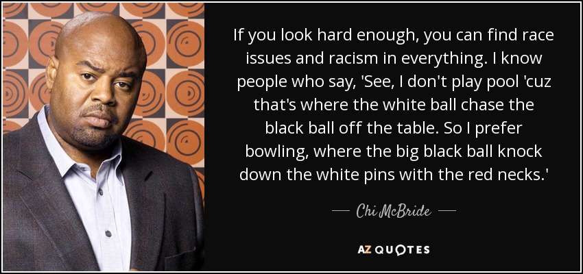 If you look hard enough, you can find race issues and racism in everything. I know people who say, 'See, I don't play pool 'cuz that's where the white ball chase the black ball off the table. So I prefer bowling, where the big black ball knock down the white pins with the red necks.'