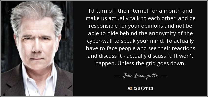 I'd turn off the internet for a month and make us actually talk to each other, and be responsible for your opinions and not be able to hide behind the anonymity of the cyber-wall to speak your mind. To actually have to face people and see their reactions and discuss it - actually discuss it. It won't happen. Unless the grid goes down.
