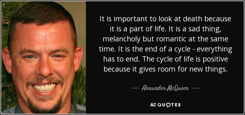 It is important to look at death because it is a part of life. It is a sad thing, melancholy but romantic at the same time. It is the end of a cycle - everything has to end. The cycle of life is positive because it gives room for new things.