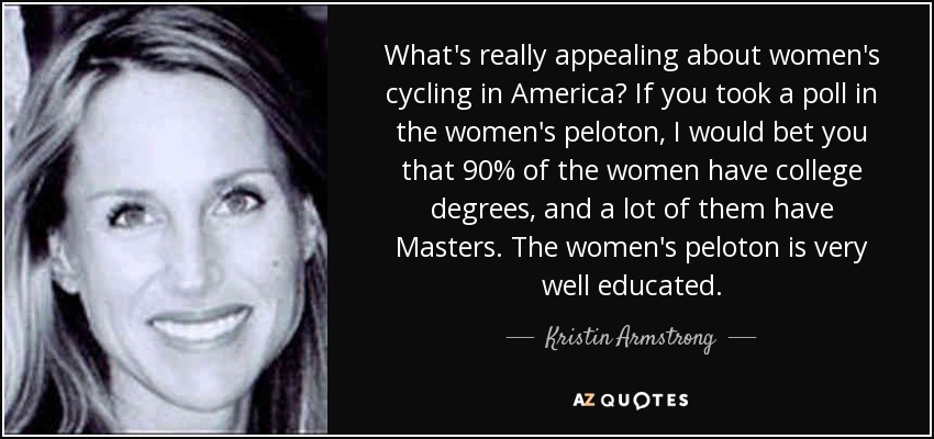 What's really appealing about women's cycling in America? If you took a poll in the women's peloton, I would bet you that 90% of the women have college degrees, and a lot of them have Masters. The women's peloton is very well educated.