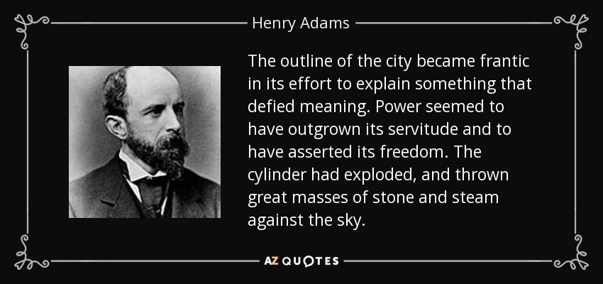 The outline of the city became frantic in its effort to explain something that defied meaning. Power seemed to have outgrown its servitude and to have asserted its freedom. The cylinder had exploded, and thrown great masses of stone and steam against the sky.