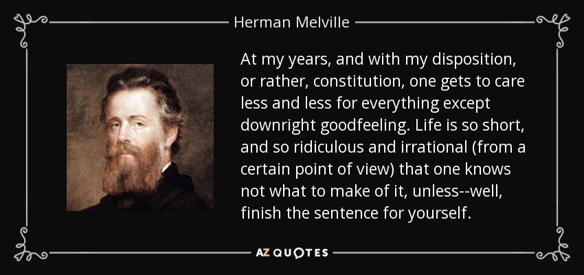 At my years, and with my disposition, or rather, constitution, one gets to care less and less for everything except downright goodfeeling. Life is so short, and so ridiculous and irrational (from a certain point of view) that one knows not what to make of it, unless--well, finish the sentence for yourself.
