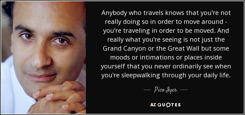 Anybody who travels knows that you're not really doing so in order to move around - you're traveling in order to be moved. And really what you're seeing is not just the Grand Canyon or the Great Wall but some moods or intimations or places inside yourself that you never ordinarily see when you're sleepwalking through your daily life.