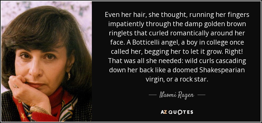 Even her hair, she thought, running her fingers impatiently through the damp golden brown ringlets that curled romantically around her face. A Botticelli angel, a boy in college once called her, begging her to let it grow. Right! That was all she needed: wild curls cascading down her back like a doomed Shakespearian virgin, or a rock star.