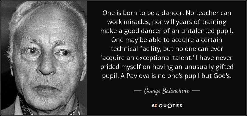 One is born to be a dancer. No teacher can work miracles, nor will years of training make a good dancer of an untalented pupil. One may be able to acquire a certain technical facility, but no one can ever 'acquire an exceptional talent.' I have never prided myself on having an unusually gifted pupil. A Pavlova is no one's pupil but God's.