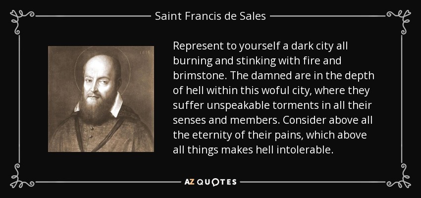Represent to yourself a dark city all burning and stinking with fire and brimstone. The damned are in the depth of hell within this woful city, where they suffer unspeakable torments in all their senses and members. Consider above all the eternity of their pains, which above all things makes hell intolerable.