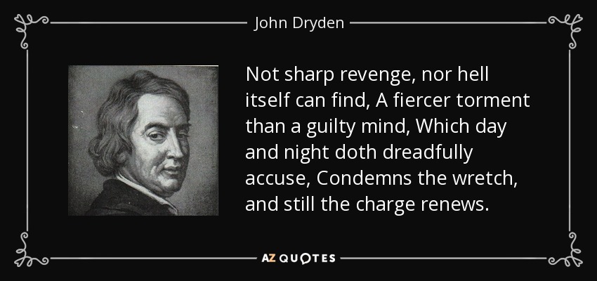 Not sharp revenge, nor hell itself can find, A fiercer torment than a guilty mind, Which day and night doth dreadfully accuse, Condemns the wretch, and still the charge renews.