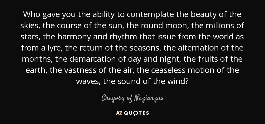Who gave you the ability to contemplate the beauty of the skies, the course of the sun, the round moon, the millions of stars, the harmony and rhythm that issue from the world as from a lyre, the return of the seasons, the alternation of the months, the demarcation of day and night, the fruits of the earth, the vastness of the air, the ceaseless motion of the waves, the sound of the wind?
