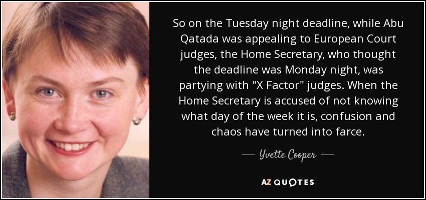 So on the Tuesday night deadline, while Abu Qatada was appealing to European Court judges, the Home Secretary, who thought the deadline was Monday night, was partying with "X Factor" judges. When the Home Secretary is accused of not knowing what day of the week it is, confusion and chaos have turned into farce.
