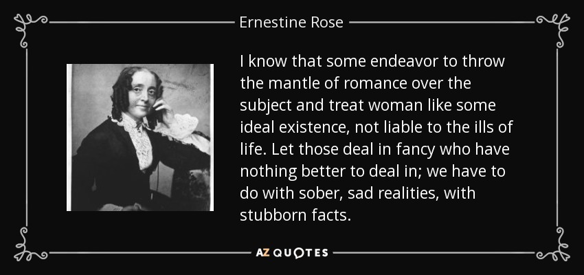I know that some endeavor to throw the mantle of romance over the subject and treat woman like some ideal existence, not liable to the ills of life. Let those deal in fancy who have nothing better to deal in; we have to do with sober, sad realities, with stubborn facts.
