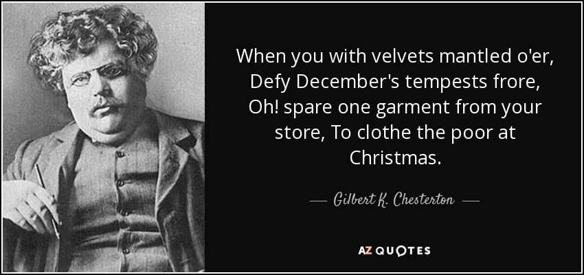 When you with velvets mantled o'er, Defy December's tempests frore, Oh! spare one garment from your store, To clothe the poor at Christmas.