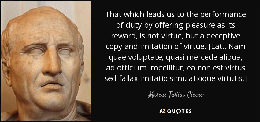 That which leads us to the performance of duty by offering pleasure as its reward, is not virtue, but a deceptive copy and imitation of virtue. [Lat., Nam quae voluptate, quasi mercede aliqua, ad officium impellitur, ea non est virtus sed fallax imitatio simulatioque virtutis.]