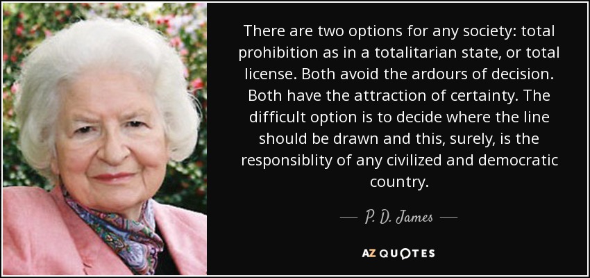 There are two options for any society: total prohibition as in a totalitarian state, or total license. Both avoid the ardours of decision. Both have the attraction of certainty. The difficult option is to decide where the line should be drawn and this, surely, is the responsiblity of any civilized and democratic country.