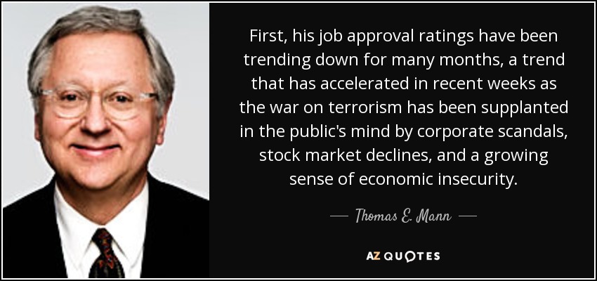 First, his job approval ratings have been trending down for many months, a trend that has accelerated in recent weeks as the war on terrorism has been supplanted in the public's mind by corporate scandals, stock market declines, and a growing sense of economic insecurity.