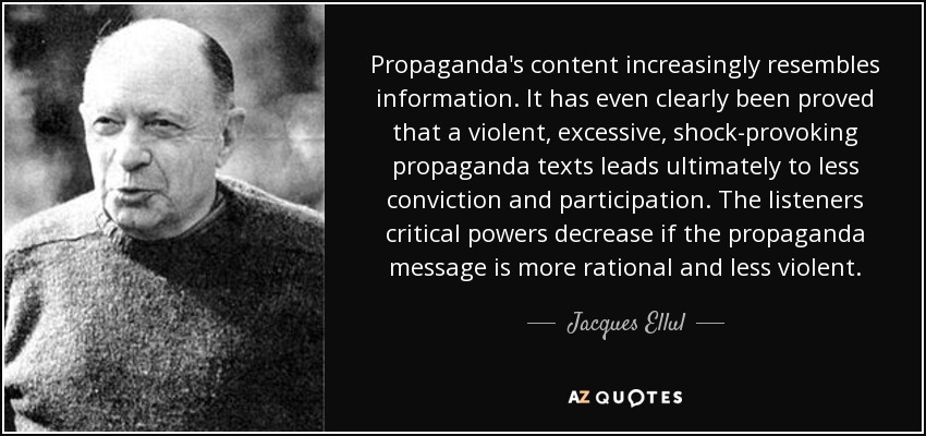 Propaganda's content increasingly resembles information. It has even clearly been proved that a violent, excessive, shock-provoking propaganda texts leads ultimately to less conviction and participation. The listeners critical powers decrease if the propaganda message is more rational and less violent.