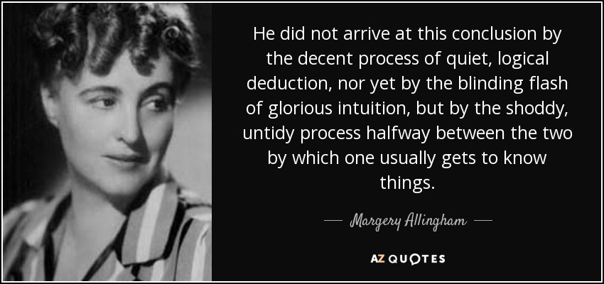 He did not arrive at this conclusion by the decent process of quiet, logical deduction, nor yet by the blinding flash of glorious intuition, but by the shoddy, untidy process halfway between the two by which one usually gets to know things.