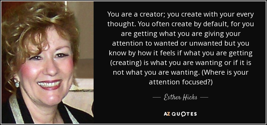 You are a creator; you create with your every thought. You often create by default, for you are getting what you are giving your attention to wanted or unwanted but you know by how it feels if what you are getting (creating) is what you are wanting or if it is not what you are wanting. (Where is your attention focused?)