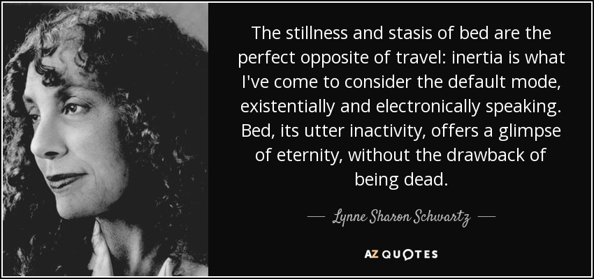 The stillness and stasis of bed are the perfect opposite of travel: inertia is what I've come to consider the default mode, existentially and electronically speaking. Bed, its utter inactivity, offers a glimpse of eternity, without the drawback of being dead.