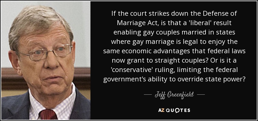 If the court strikes down the Defense of Marriage Act, is that a 'liberal' result enabling gay couples married in states where gay marriage is legal to enjoy the same economic advantages that federal laws now grant to straight couples? Or is it a 'conservative' ruling, limiting the federal government's ability to override state power?