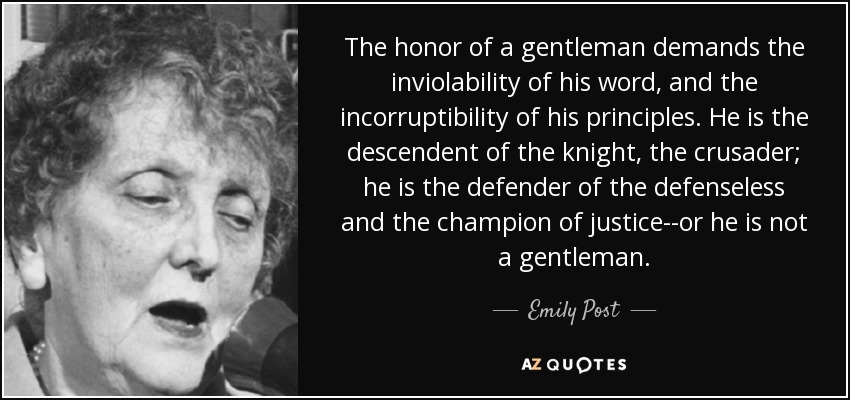 The honor of a gentleman demands the inviolability of his word, and the incorruptibility of his principles. He is the descendent of the knight, the crusader; he is the defender of the defenseless and the champion of justice--or he is not a gentleman.