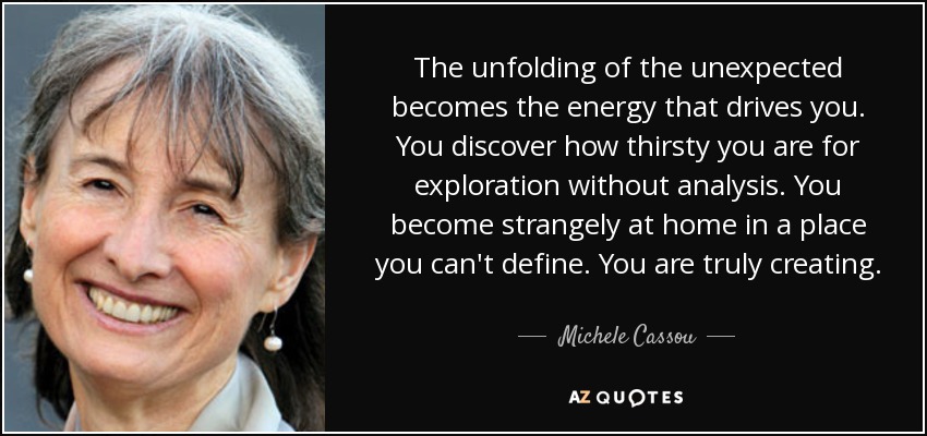 The unfolding of the unexpected becomes the energy that drives you. You discover how thirsty you are for exploration without analysis. You become strangely at home in a place you can't define. You are truly creating.