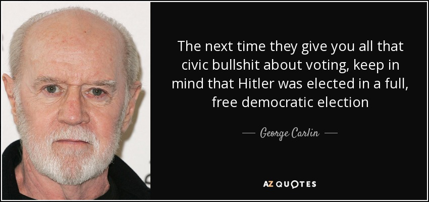 The next time they give you all that civic bullshit about voting, keep in mind that Hitler was elected in a full, free democratic election