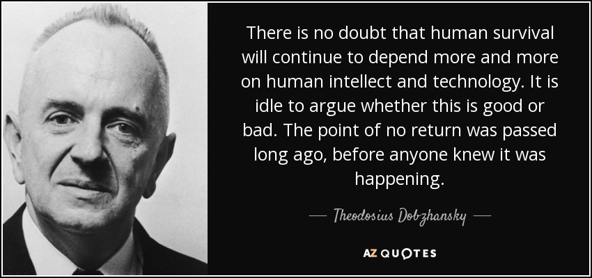 There is no doubt that human survival will continue to depend more and more on human intellect and technology. It is idle to argue whether this is good or bad. The point of no return was passed long ago, before anyone knew it was happening.