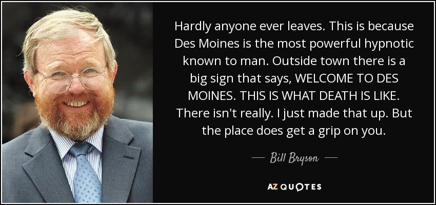Hardly anyone ever leaves. This is because Des Moines is the most powerful hypnotic known to man. Outside town there is a big sign that says, WELCOME TO DES MOINES. THIS IS WHAT DEATH IS LIKE. There isn't really. I just made that up. But the place does get a grip on you.