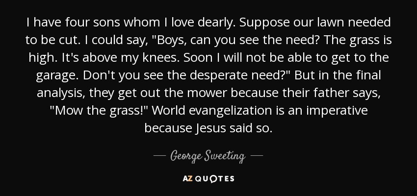 I have four sons whom I love dearly. Suppose our lawn needed to be cut. I could say, "Boys, can you see the need? The grass is high. It's above my knees. Soon I will not be able to get to the garage. Don't you see the desperate need?" But in the final analysis, they get out the mower because their father says, "Mow the grass!" World evangelization is an imperative because Jesus said so.