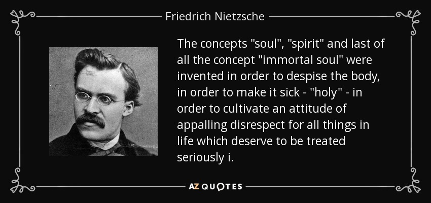 The concepts "soul", "spirit" and last of all the concept "immortal soul" were invented in order to despise the body, in order to make it sick - "holy" - in order to cultivate an attitude of appalling disrespect for all things in life which deserve to be treated seriously i.