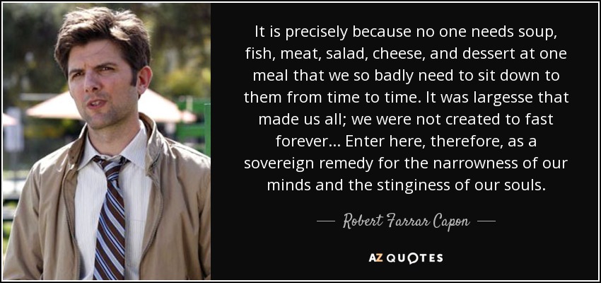 It is precisely because no one needs soup, fish, meat, salad, cheese, and dessert at one meal that we so badly need to sit down to them from time to time. It was largesse that made us all; we were not created to fast forever... Enter here, therefore, as a sovereign remedy for the narrowness of our minds and the stinginess of our souls.