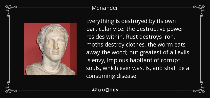 Everything is destroyed by its own particular vice: the destructive power resides within. Rust destroys iron, moths destroy clothes, the worm eats away the wood; but greatest of all evils is envy, impious habitant of corrupt souls, which ever was, is, and shall be a consuming disease.