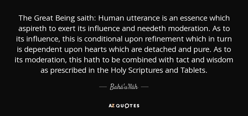 The Great Being saith: Human utterance is an essence which aspireth to exert its influence and needeth moderation. As to its influence, this is conditional upon refinement which in turn is dependent upon hearts which are detached and pure. As to its moderation, this hath to be combined with tact and wisdom as prescribed in the Holy Scriptures and Tablets.