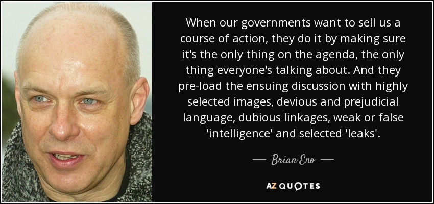 When our governments want to sell us a course of action, they do it by making sure it's the only thing on the agenda, the only thing everyone's talking about. And they pre-load the ensuing discussion with highly selected images, devious and prejudicial language, dubious linkages, weak or false 'intelligence' and selected 'leaks'.