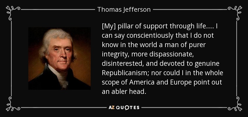 [My] pillar of support through life.... I can say conscientiously that I do not know in the world a man of purer integrity, more dispassionate, disinterested, and devoted to genuine Republicanism; nor could I in the whole scope of America and Europe point out an abler head.