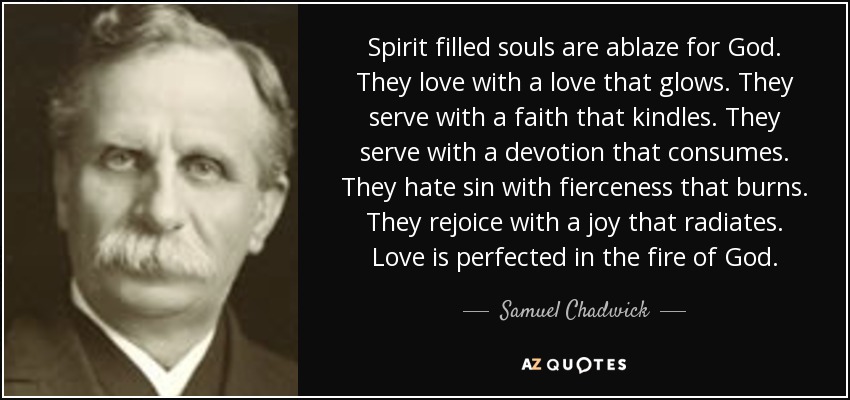 Spirit filled souls are ablaze for God. They love with a love that glows. They serve with a faith that kindles. They serve with a devotion that consumes. They hate sin with fierceness that burns. They rejoice with a joy that radiates. Love is perfected in the fire of God.