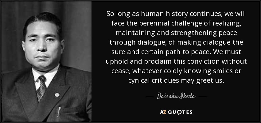 So long as human history continues, we will face the perennial challenge of realizing, maintaining and strengthening peace through dialogue, of making dialogue the sure and certain path to peace. We must uphold and proclaim this conviction without cease, whatever coldly knowing smiles or cynical critiques may greet us.