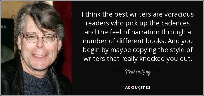 I think the best writers are voracious readers who pick up the cadences and the feel of narration through a number of different books. And you begin by maybe copying the style of writers that really knocked you out.