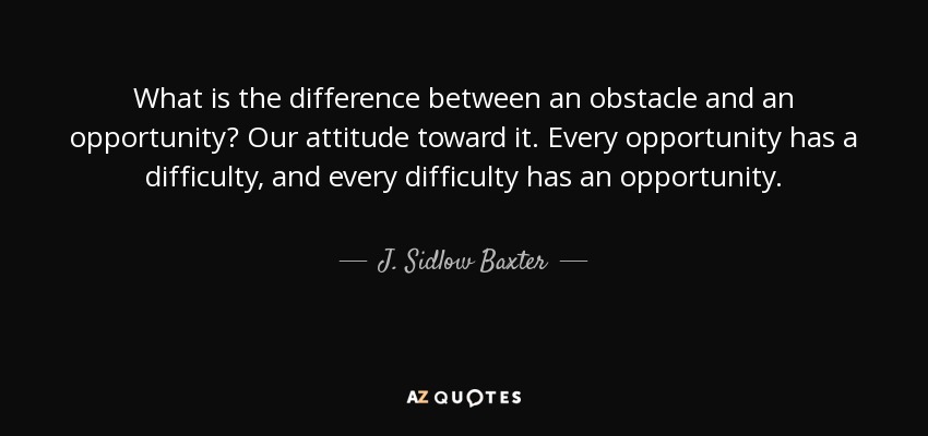 What is the difference between an obstacle and an opportunity? Our attitude toward it. Every opportunity has a difficulty, and every difficulty has an opportunity.