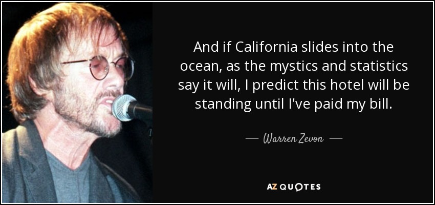 And if California slides into the ocean, as the mystics and statistics say it will, I predict this hotel will be standing until I've paid my bill.