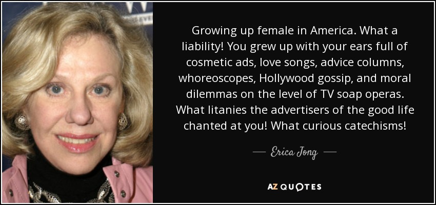 Growing up female in America. What a liability! You grew up with your ears full of cosmetic ads, love songs, advice columns, whoreoscopes, Hollywood gossip, and moral dilemmas on the level of TV soap operas. What litanies the advertisers of the good life chanted at you! What curious catechisms!