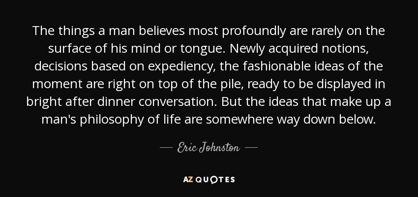 The things a man believes most profoundly are rarely on the surface of his mind or tongue. Newly acquired notions, decisions based on expediency, the fashionable ideas of the moment are right on top of the pile, ready to be displayed in bright after dinner conversation. But the ideas that make up a man's philosophy of life are somewhere way down below.