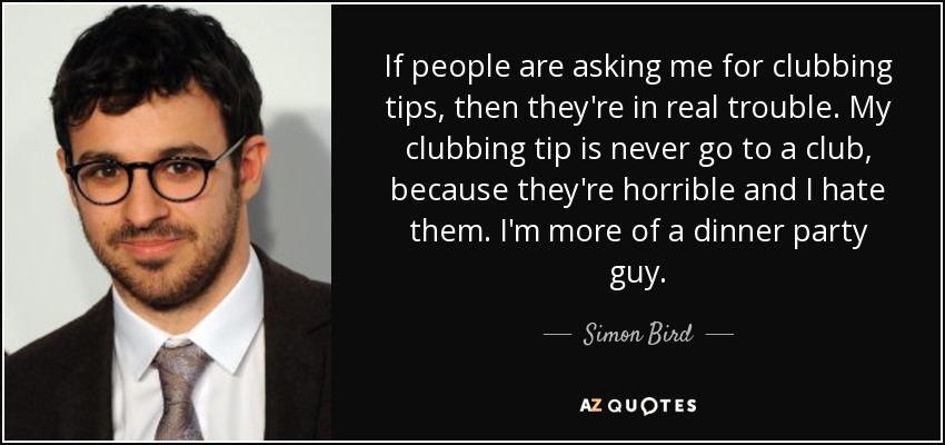 If people are asking me for clubbing tips, then they're in real trouble. My clubbing tip is never go to a club, because they're horrible and I hate them. I'm more of a dinner party guy.
