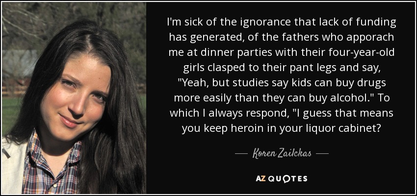 I'm sick of the ignorance that lack of funding has generated, of the fathers who apporach me at dinner parties with their four-year-old girls clasped to their pant legs and say, "Yeah, but studies say kids can buy drugs more easily than they can buy alcohol." To which I always respond, "I guess that means you keep heroin in your liquor cabinet?