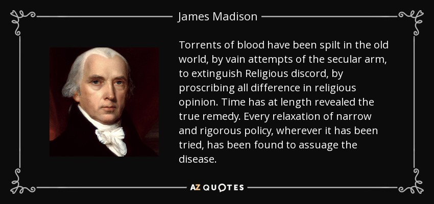 Torrents of blood have been spilt in the old world, by vain attempts of the secular arm, to extinguish Religious discord, by proscribing all difference in religious opinion. Time has at length revealed the true remedy. Every relaxation of narrow and rigorous policy, wherever it has been tried, has been found to assuage the disease.